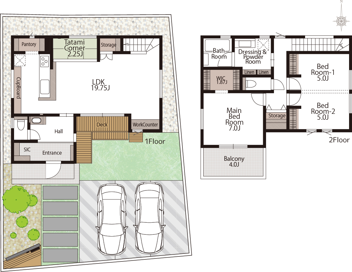 - 間 取:2LDK(将来的に3LDKに変更可能)+畳コーナー+WIC+SIC+パントリー