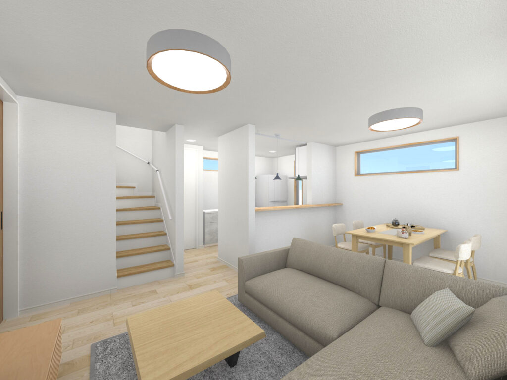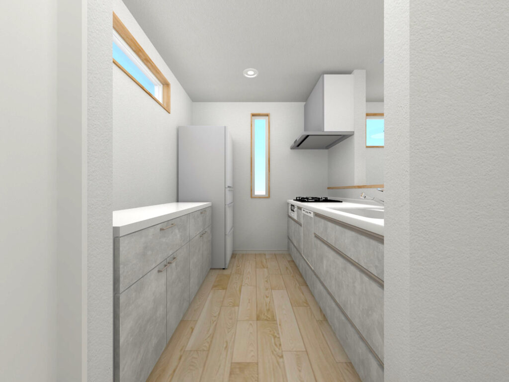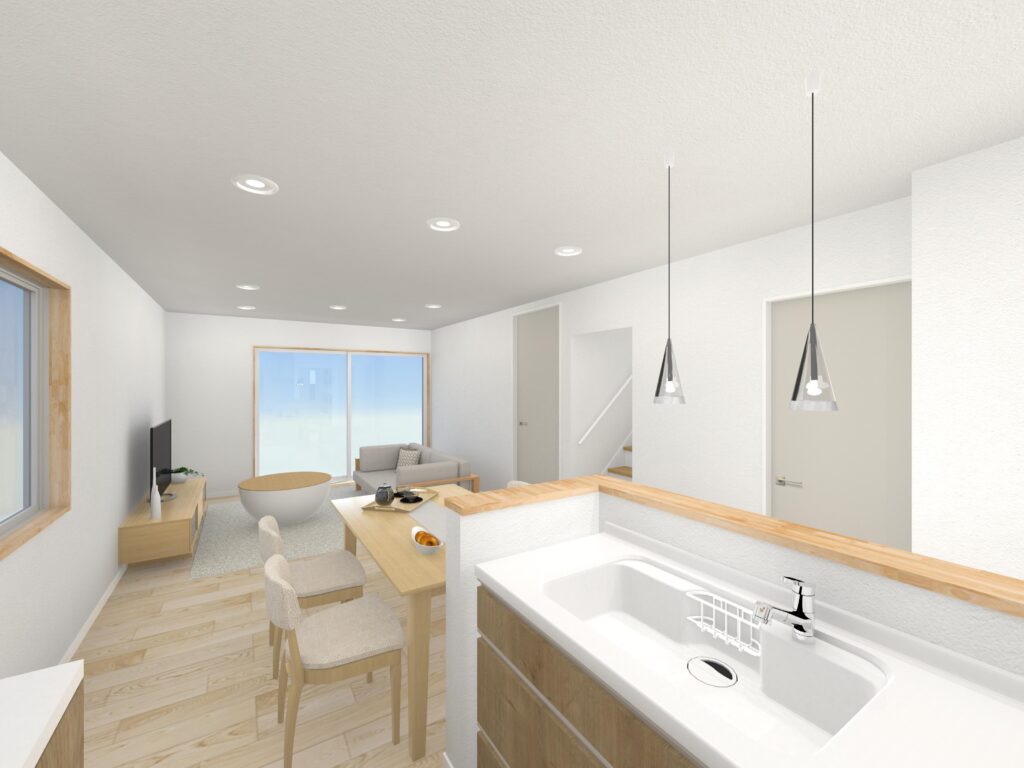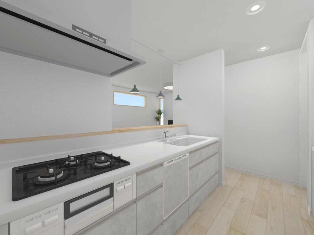 ↓ カウンタータイプのキッチンは、リビング・ダイニングと一体化することで、家族とのコミュニケーションが取りやすく、調理や配膳、片付けがスムーズになります。仕切りがないため空間が広く開放的に感じられ、生活空間全体を見渡せることでお子様を見守る安心感も得られます