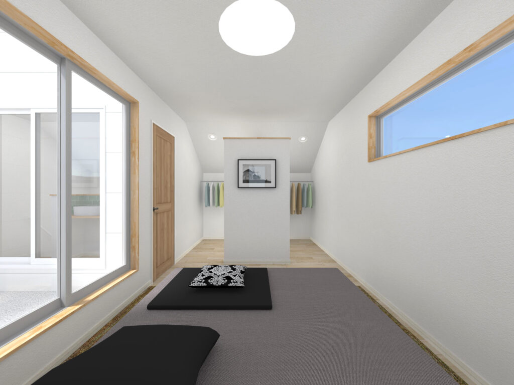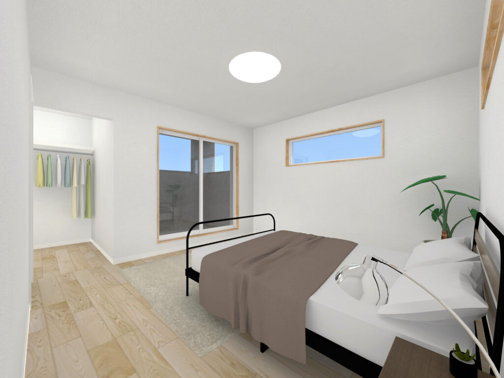 ↓ 2階主寝室は8帖のスペース。主寝室からは2帖のウォークインクローゼットと、3畳のインナーバルコニーへつながります