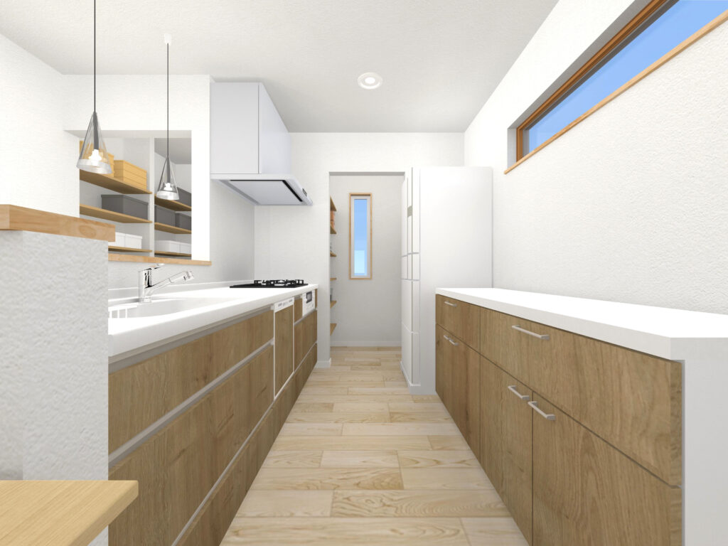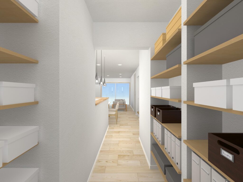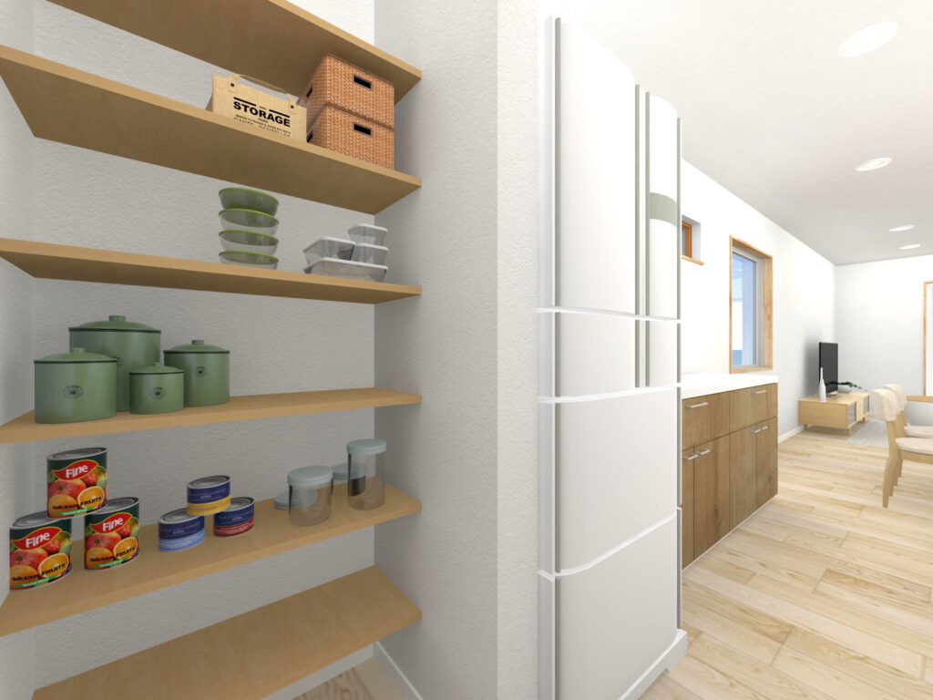 ↓ キッチンに併設したパントリーは買いだめや災害時の備蓄に便利。また収納力が高まりキッチンが整理され、すっきりしたキッチンを保てて作業効率もアップします