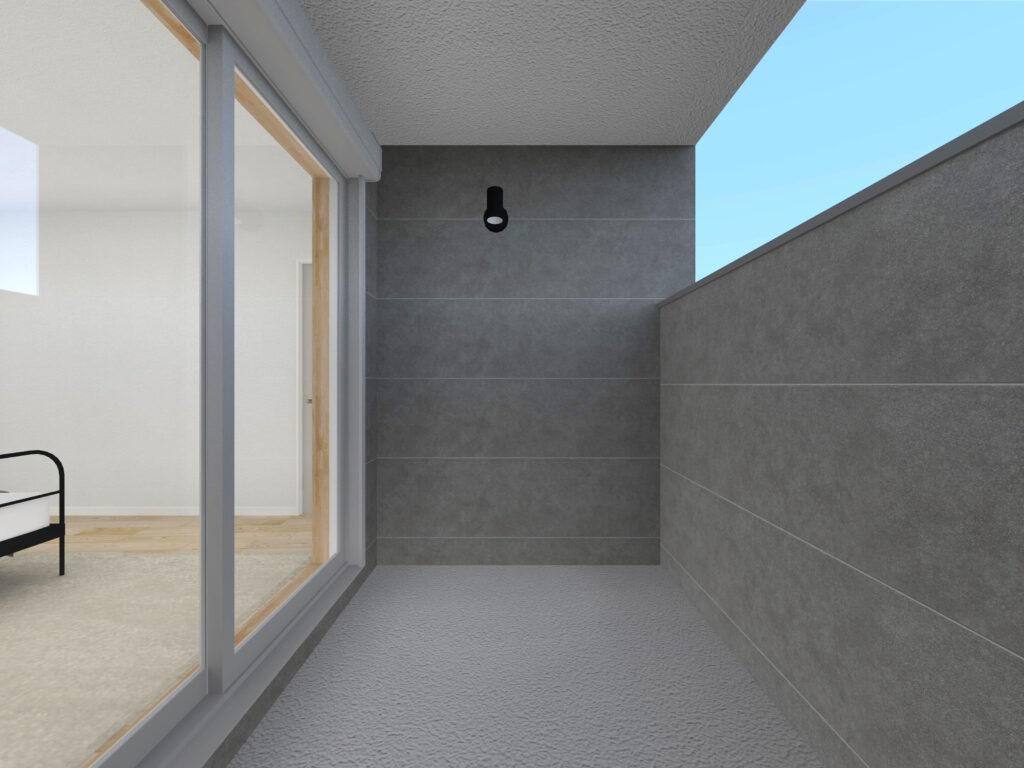 ↓ バルコニーの壁は一定の高さがあり、バルコニーの壁は高さがあり、寝室のプライバシーが保てます。また屋根付きのインナーバルコニーのため、急な雨の日も洗濯物が安心です