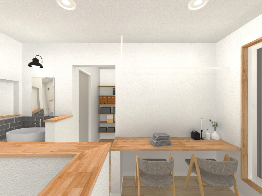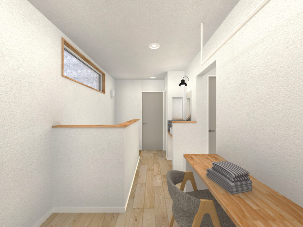 2階ホールにある、室内物干しができるハンガーハイプのあるカウンター