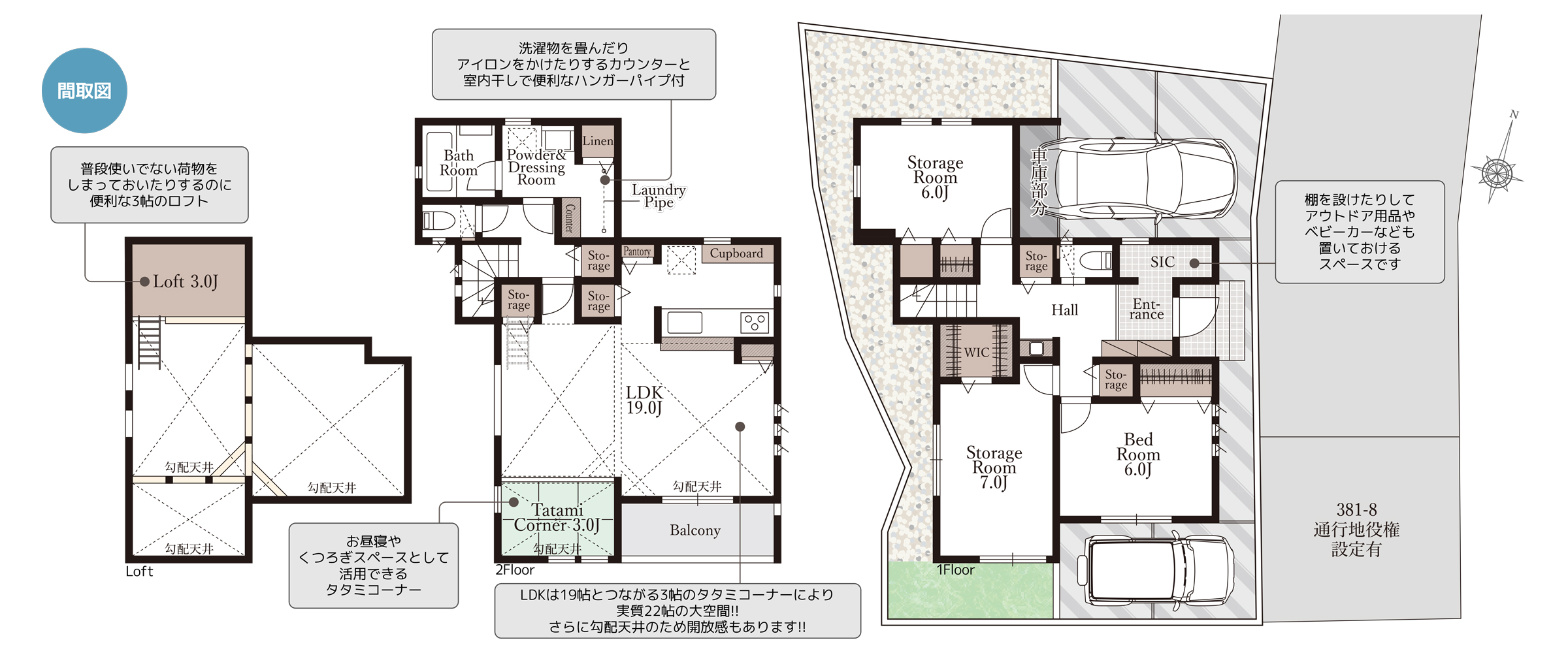 建物面積 | 113.40㎡(34.30坪)※車庫部分2.43㎡含む | 間取り | 1LDK+タタミコーナー+納戸×2+WIC+SIC+ロフト |